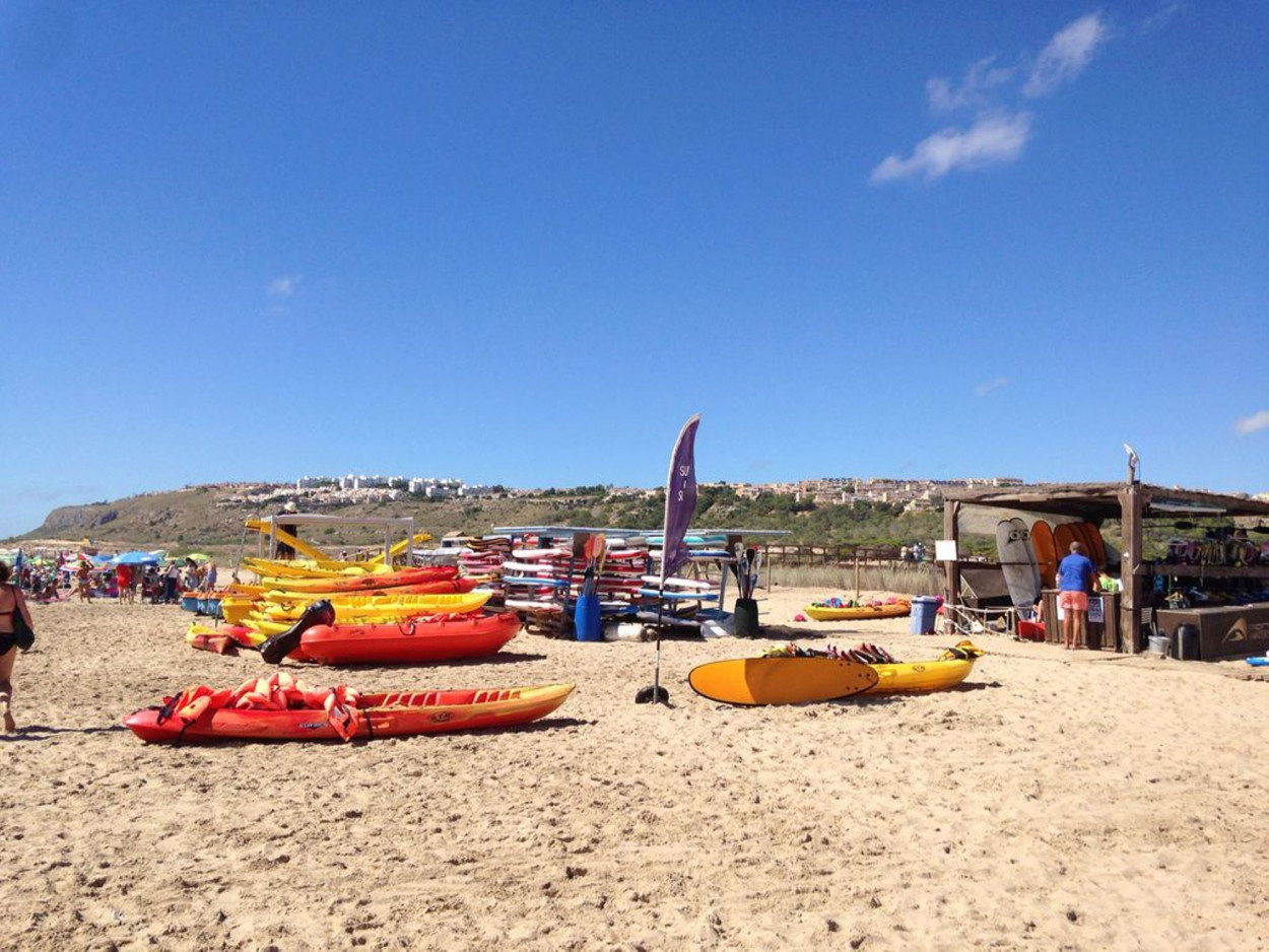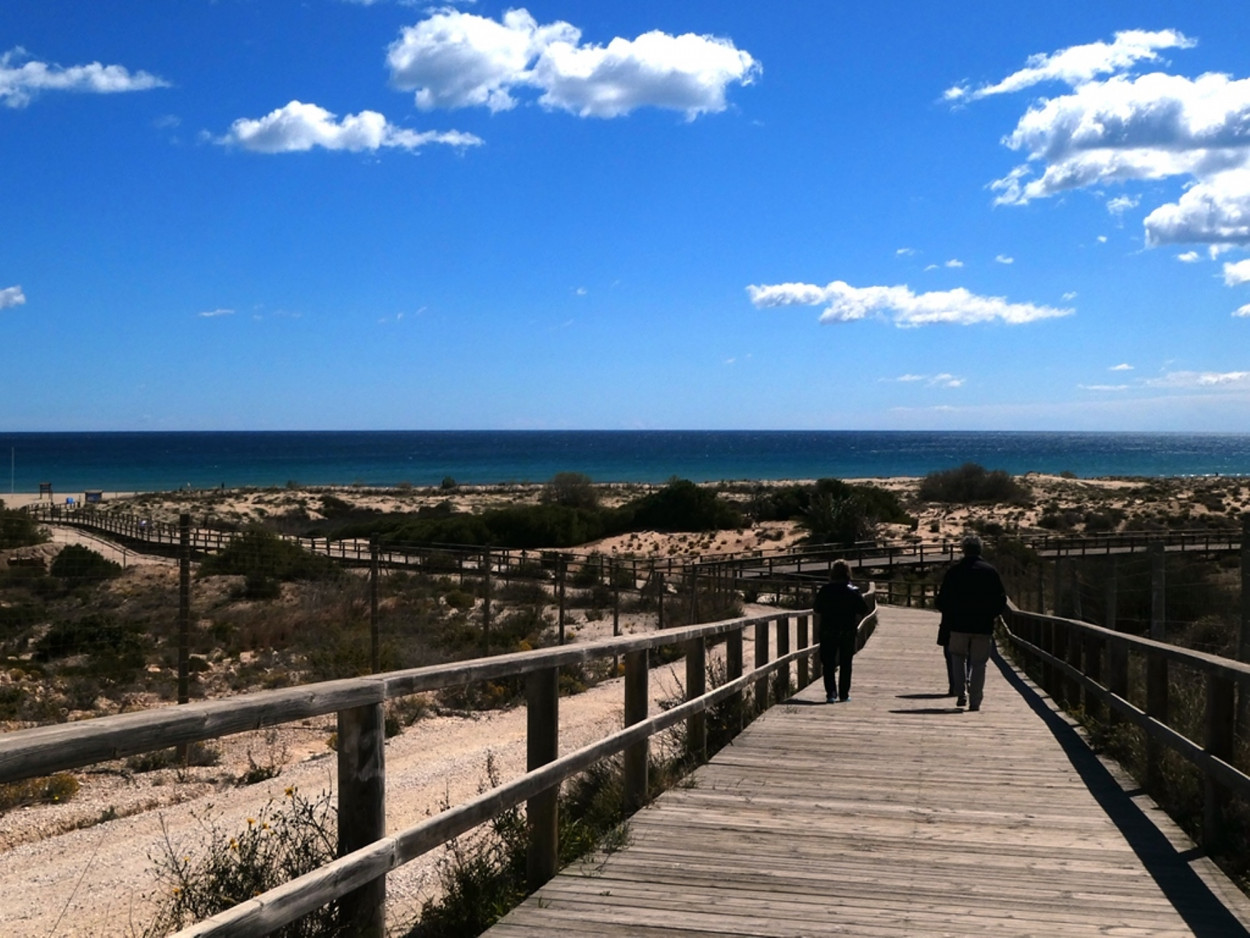 ... der Hauptstrand von Gran Alacant, bietet feinen, goldenen Sand und kristallklares Wasser, perfekt für Sonnenanbeter, Schwimmer und Wassersportbegeisterte. Die weitläufige Dünenlandschaft, die den Strand umgibt, ist ein geschütztes Naturgebiet, das sich hervorragend für entspannte Spaziergänge eignet.